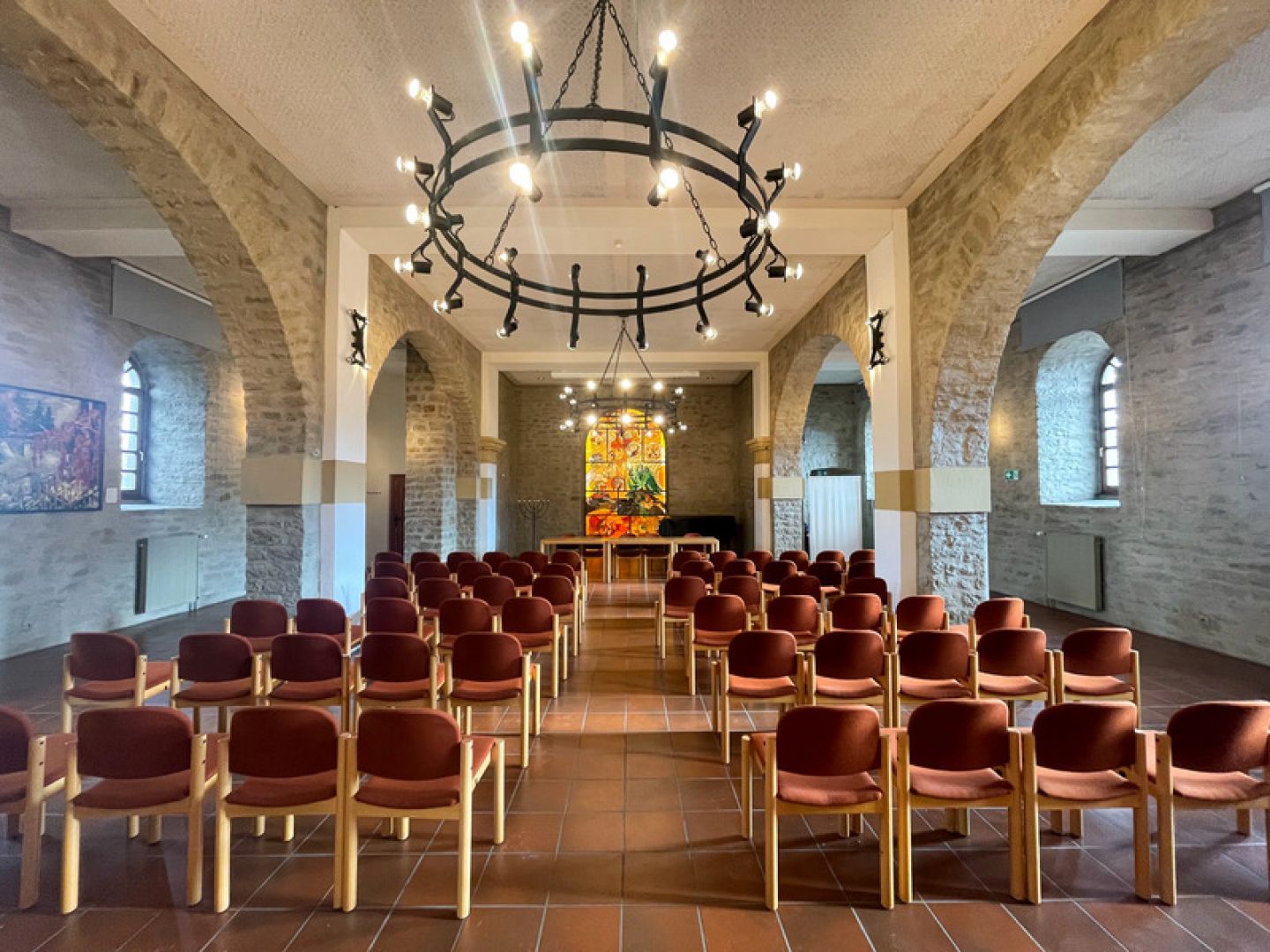 For meetings, workshops and events, the Meisenheimer Hof offers several rooms with distinctive character. The Rittersaal with its adjoining Boos-von-Waldeck Room is ideal for smaller gatherings, while the former synagogue, with its impressive acoustics, accommodates up to 80 guests. Just a few steps from the hotel lies the former Lutheran church – once the town’s granary – an inspiring venue in every sense. Its open architecture, soaring ceilings, abundant daylight and permanent stage create space for inspiration and exchange, making it ideal for lectures, presentations or panel discussions (up to 90 people in theatre style, 50 in classroom seating). In addition, the Nicolas Appert Cooking School is available for creative team events, and the Historic Granary provides a special setting for exclusive occasions.